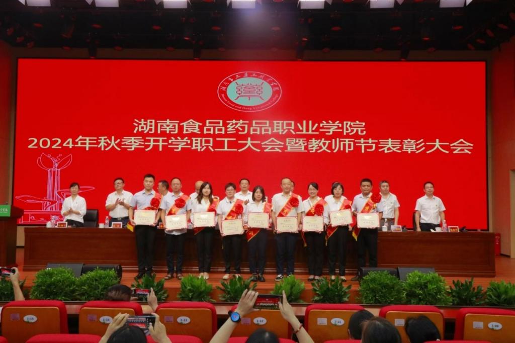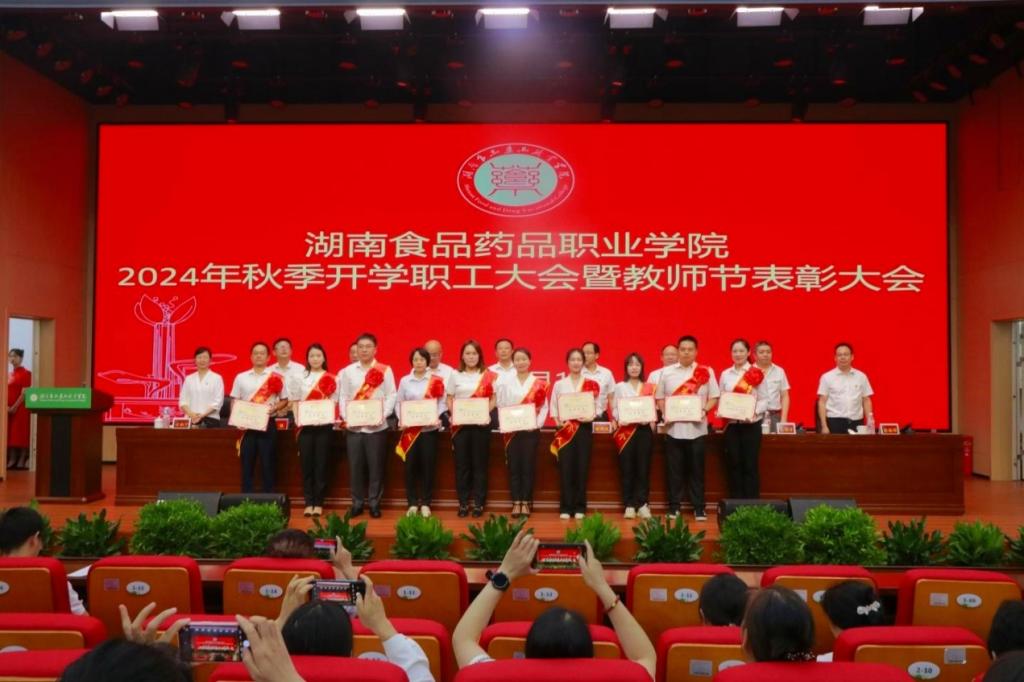 黨委委員、副校長鄧興國宣讀了湖南食品藥品職業(yè)學(xué)院關(guān)于2023-2024學(xué)年優(yōu)秀教師、優(yōu)秀教育工作者的決定。萬能等18名同志獲得“優(yōu)秀教師”榮譽(yù)稱號,王華、蔣偉紅同志獲得“優(yōu)秀教育工作者”榮譽(yù)稱號。與會領(lǐng)導(dǎo)為獲得以上榮譽(yù)的教師代表頒獎,并勉勵(lì)大家珍惜榮譽(yù),再接再厲,發(fā)揮模范作用,再創(chuàng)新的業(yè)績。
