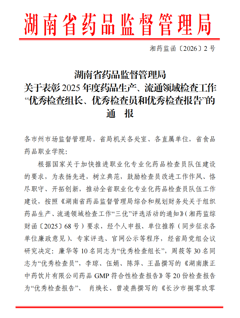 1月16日,湖南省藥品監(jiān)督管理局印發(fā)《關(guān)于表彰2025年度藥品生產(chǎn)、流通領(lǐng)域檢查工作…